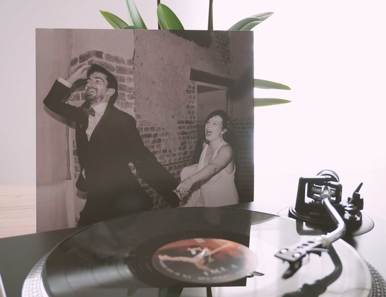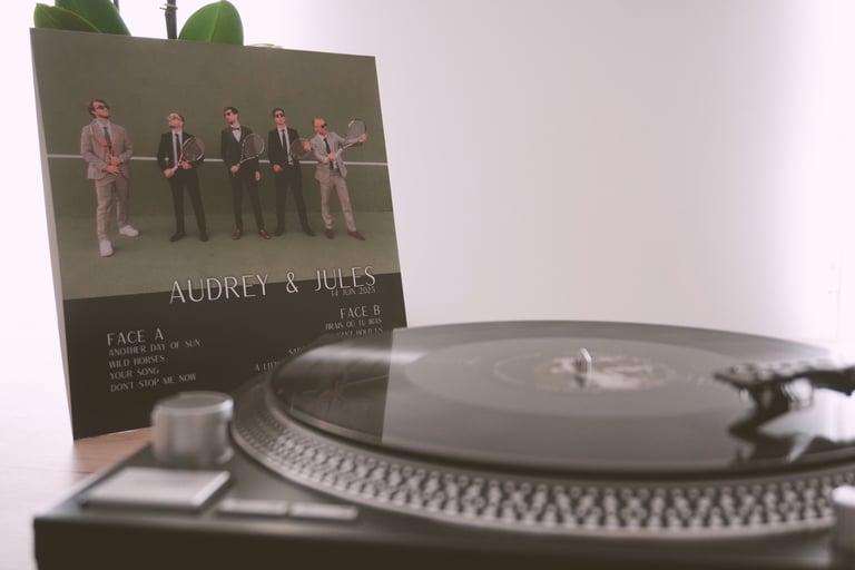 Recevez chez vous, quelques mois après votre mariage, un magnifique vinyle à votre image. Vous pourrez alors conserver sur ce vinyle les souvenirs des musiques qui auront marqué les temps forts de votre journée.